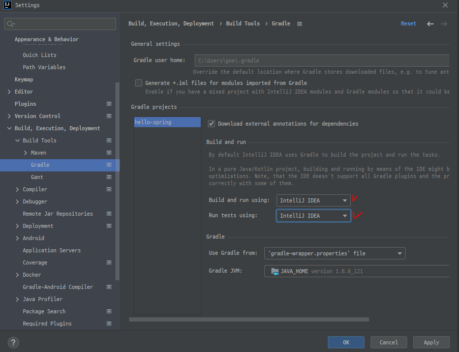 Build and run 할 때 Gradle 사용하는것보다 InteliJ IDEA를 사용하는게 속도가 더 빠르다.