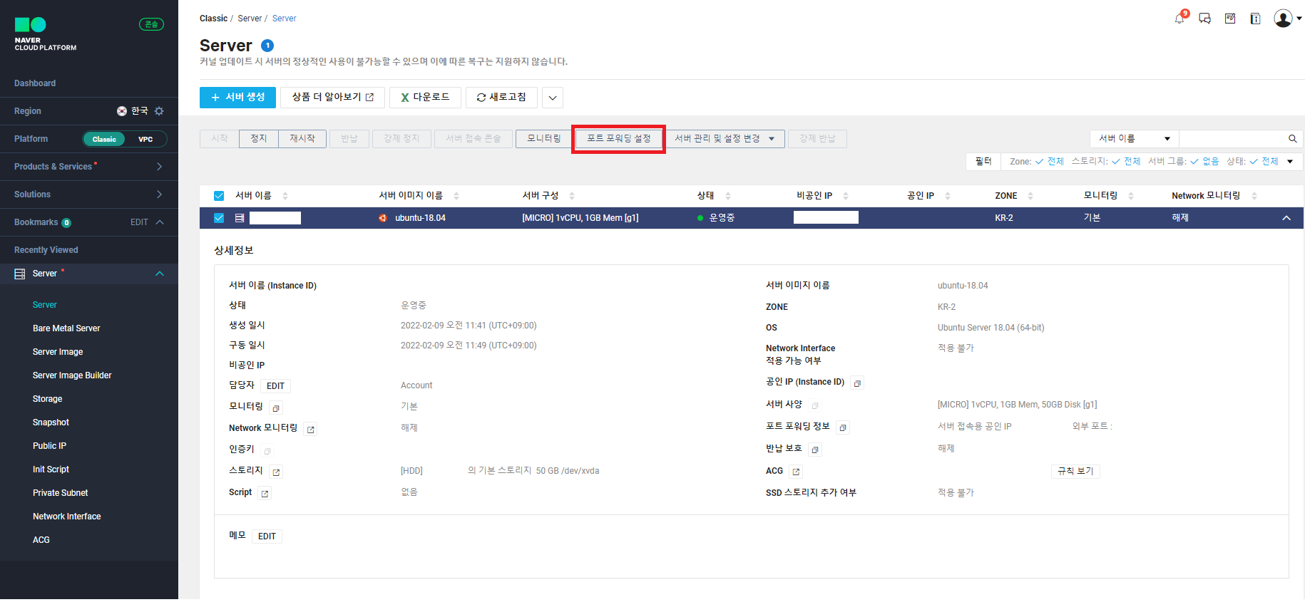 네이버 클라우드 콘솔 화면에 들어간다. 진짜 오랜만이다... 콘솔에서 서버를 선택하면 상단의 포트 포워딩 설정 버튼이 활성화되는데 클릭해서 포트 포워딩 설정을 해주면 된다.