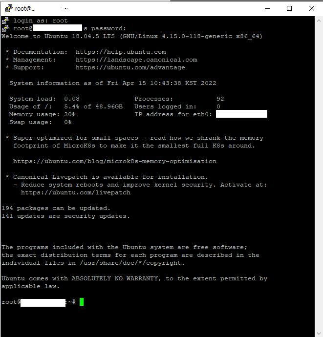 그러면 우리는 이제 포트포워딩도 끝내고, 비밀번호도 받았기 때문에 puTTY를 통해 서버에 접근할 수 있게 된다.